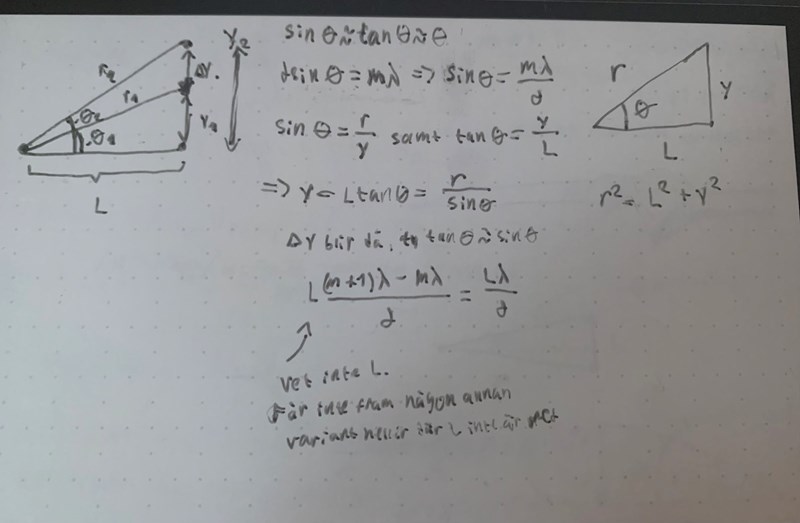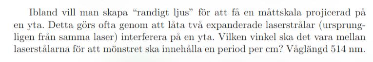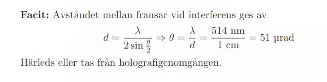 Holografigenomgången var en företeelse som skedde cirka 2010 (detta är en tentafråga från år 2010). Jag är med på hur det fungerar om man vet skärmavståndet, men jag lyckas inte komma fram till ett uttryck där skärmavståndet inte är med. Jag har även Googlat samt läst i min fysikbok, och de har endast härledningar för formeln när skärmavståndet är känt.