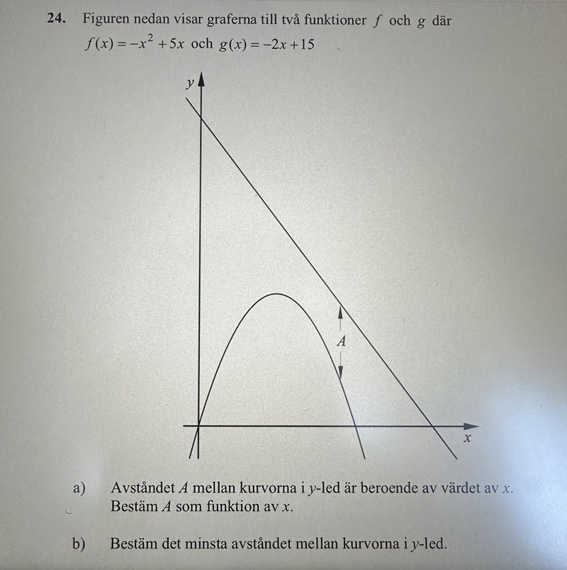 Kan du se i bilden vilket y-värde den blå kurvan har när den är som minst? Det kan vara bra att tänka på att symmetrilinjen är mittemellan x = 2 och x = 5 (där är det lätt att läsa av kurvan).