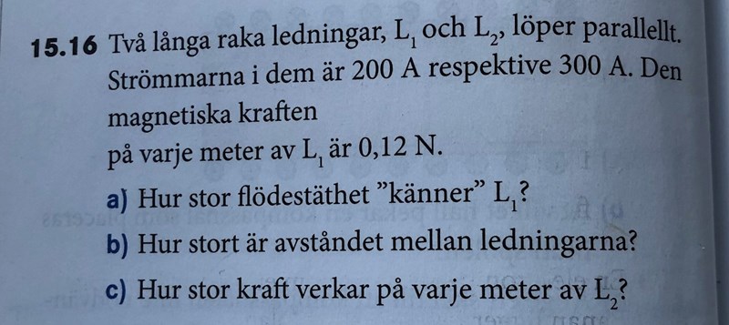 Peter skrev:Formeln F=BIL, som jag brukar skriva den för att det är lättare att uttala och komma ihåg, beskriver hur stor kraft en ledare känner av när den befinner sig i ett magnetfält när det går en ström genom ledaren. Den kan du använda rakt av i uppgift a. Det står att varje meter av ledaren känner en kraft på 0,12 N. D.v.s. L=1 m, F=0,12 N och I=200 A. Då får du fram ett B som talar om hur stort magnetfältet är vid L1. Detta fält kommer från L2 men det spelar ingen roll för lösningen av a.