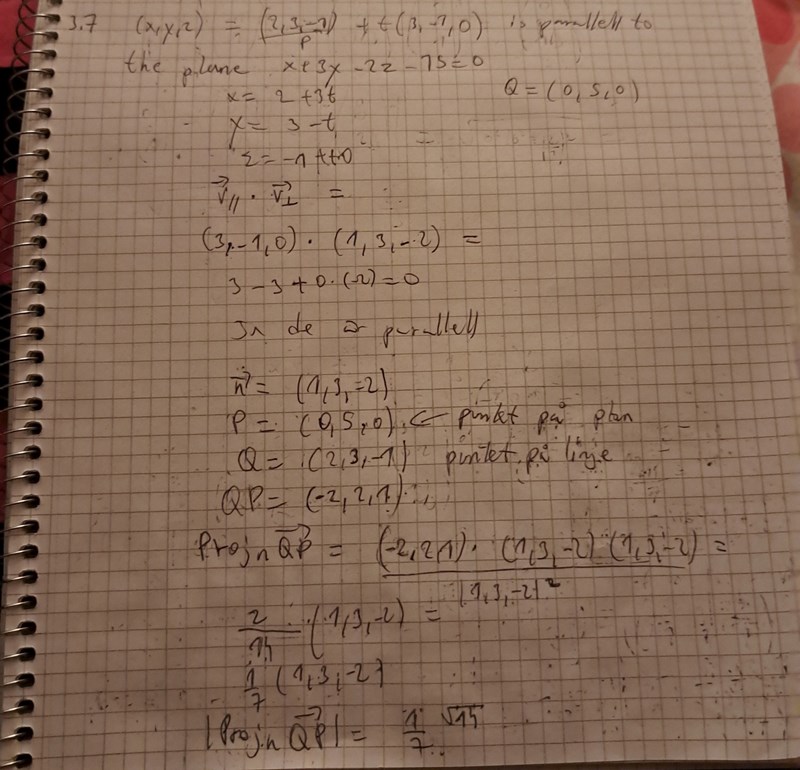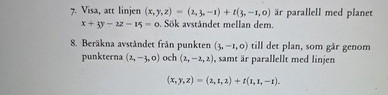 Jag vet ej om jag tänker rätt i uppgift 7. Men jag tog kryssprodukten av riktningsvektorn samt planets normalvektor. Sen hittade jag punkt om vi kallar den P= (0,5,0) som uppfyller planets ekvation. Ska man ta då den där punkten och subtrahera från punkten som linjen startar med dvs Q= (2,3,-1)? För då får vi avstånd=|QP-projnQP|. Jag är osäker om man kan tänka så.