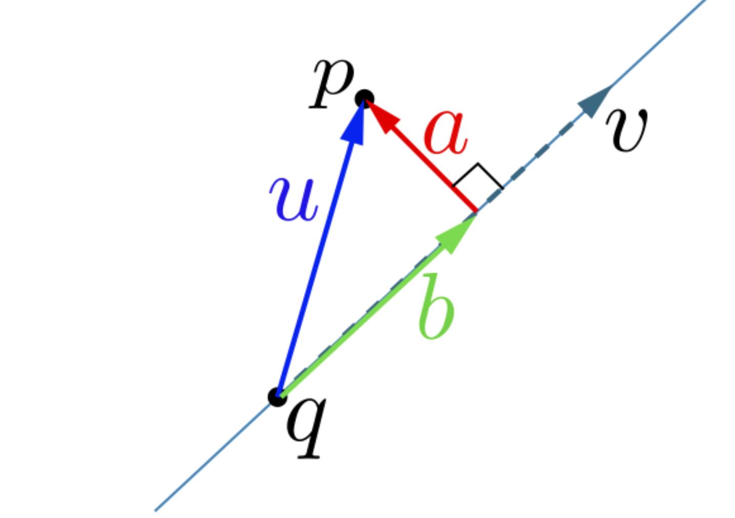 Marilyn har redan svarat men tolkar det som att du vill lösa det genom att projicera skillnadsvektorn på linjen. Om så är fallet spelar det ingen roll var på linjen q ligger. Om du rör på q längs linjen kommer projektionen b ändras, men vektorn a kommer vara samma. Välj alltså ett t-värde som du tror gör uträkningen enklast. t=1 som du nämnde låter väl rimligast.