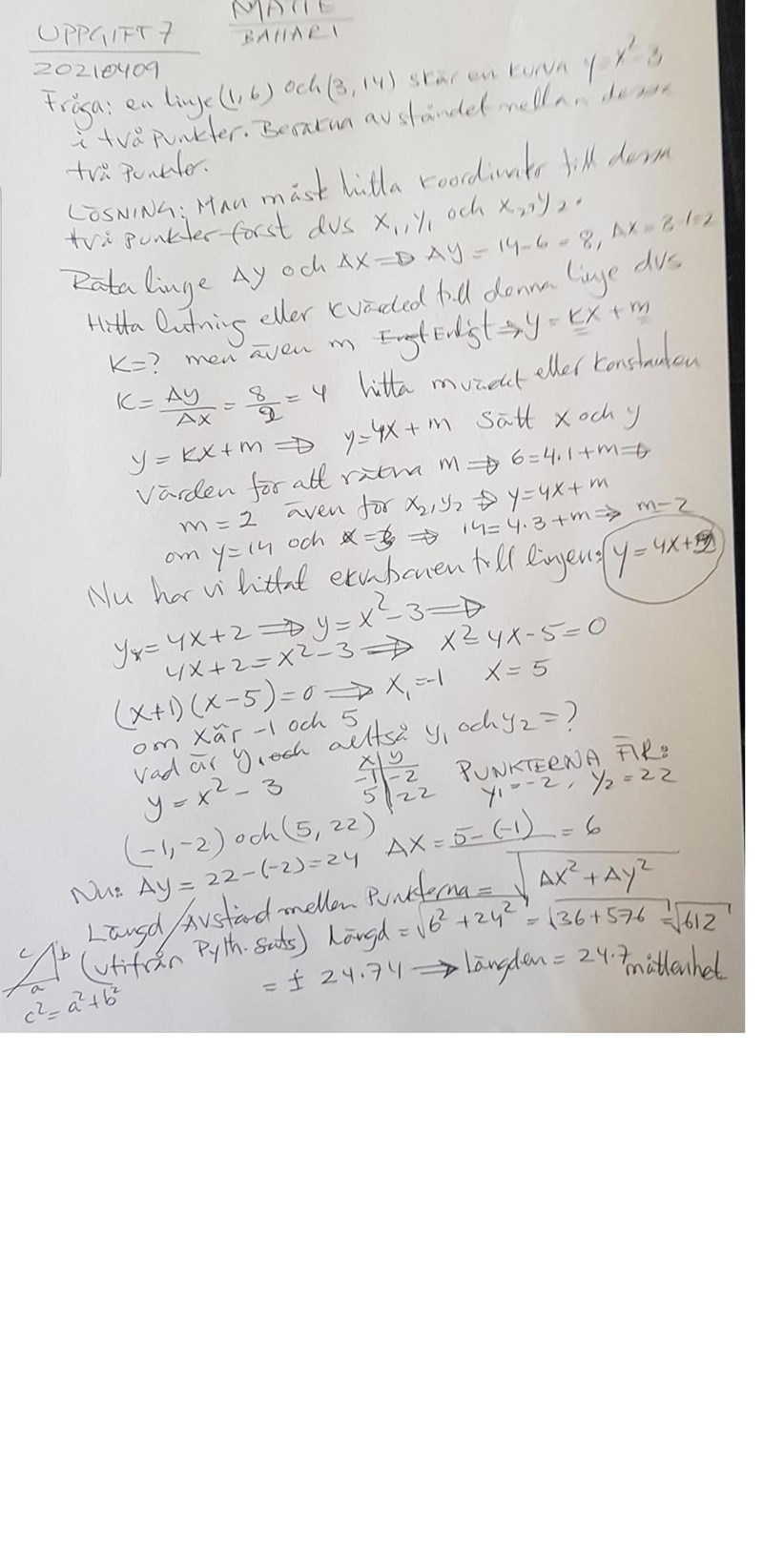 y = x2 - 3 i två punkter. Bestäm avståndet mellan dessa punkter.