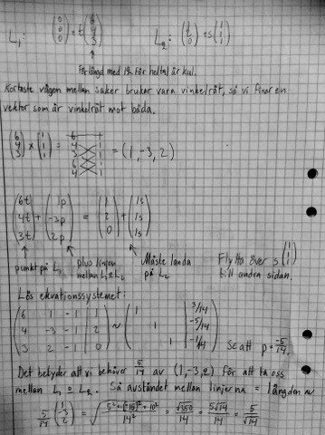 Ett alternativ är att betrakta det som ett optimeringsproblem. Parametrisera första linjen med och andra med . Sök sedan minimum: