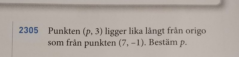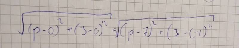 Hej och tack för snabbt svar! Min tanke är då är ställa upp enligt bilden, alltså att avståndet mellan (p,3) och origo är lika med avståndet mellan (7,-1) och origo. Får inte ihop det ändå, undrar var jag går fel? 😊