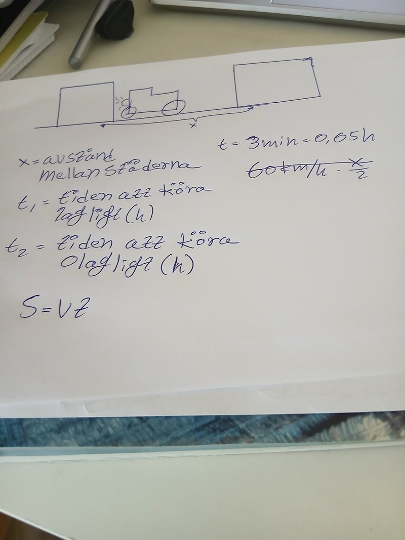 - Tiden det tar att köra första halvan av sträckan lagligt får du med hjälp av t = s/v, där s = x/2 och v = 60 km/h.