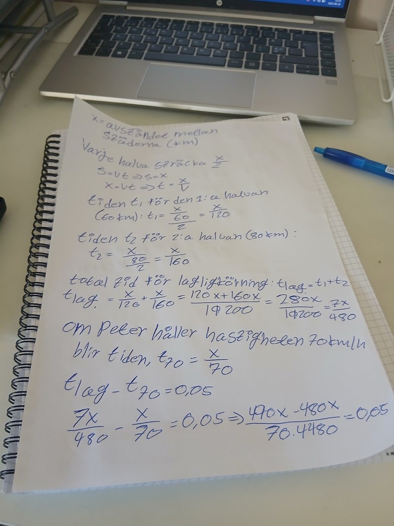 Använd s = v*t för att ställa upp sambandet mellan sträckan x, hastigheten 70 km/h och tiden t2.