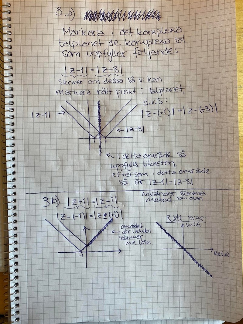 Hej! Jag har en fråga om nedanstående uppgift. Jag ska markera i det komplexa talplanet de komplexa tal som uppfyller följande likheter. På fråga 3 a), så har jag fått rätt svar, så jag antog att metoden jag använde skulle funka även på uppgift 3 b).