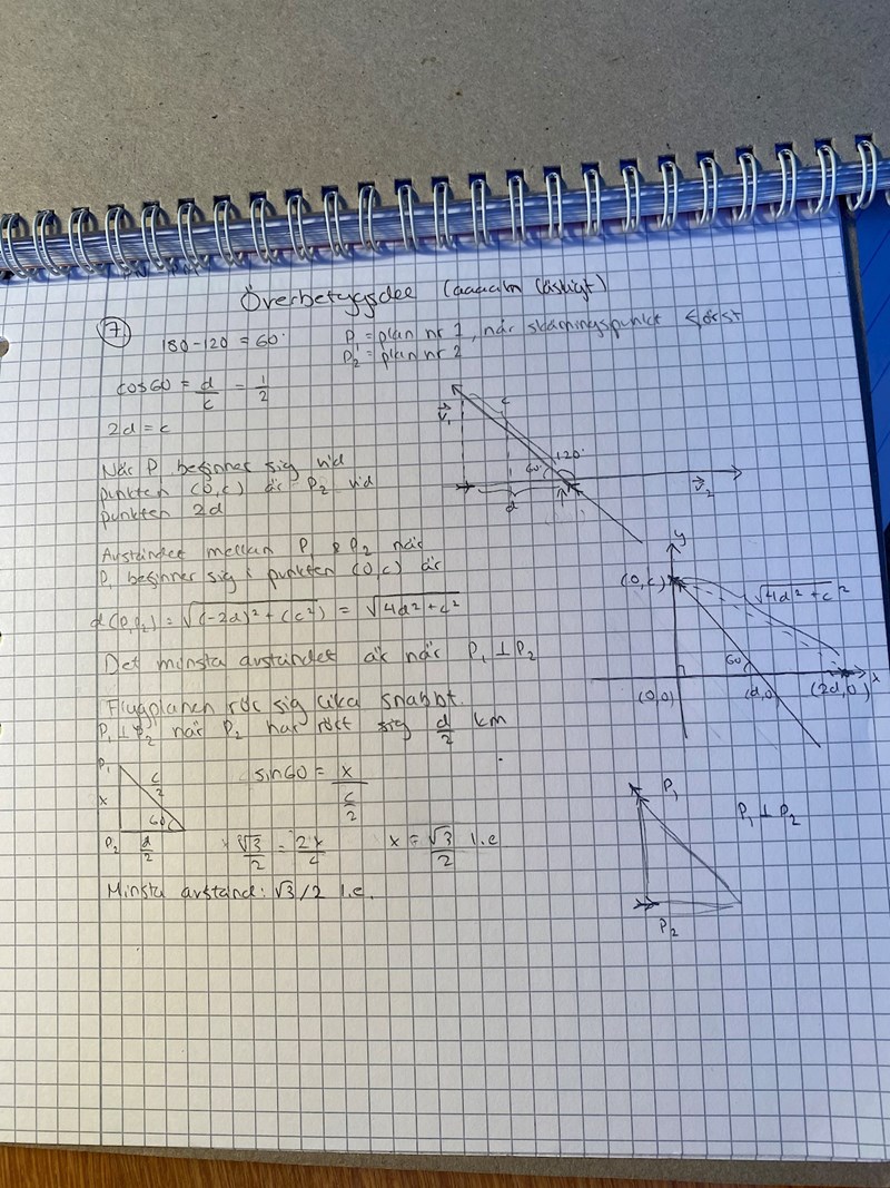 "Två flygplan flyger med samma konstanta fart v km/h i två räta linjer, vilka ligger i samma plan och skär varandra med vinkeln 120◦, där det är vinkeln mellan flygplanens riktningsvektorer som avses. När det första planet når linjernas skärningspunkt, har det andra planet d km kvar dit. Vad är det minsta avståndet som planen kommer att befinna sig på, och vid vilken tidpunkt inträffar det, i förhållande till tidpunkten då det förstaplanet når skärningspunkten?"