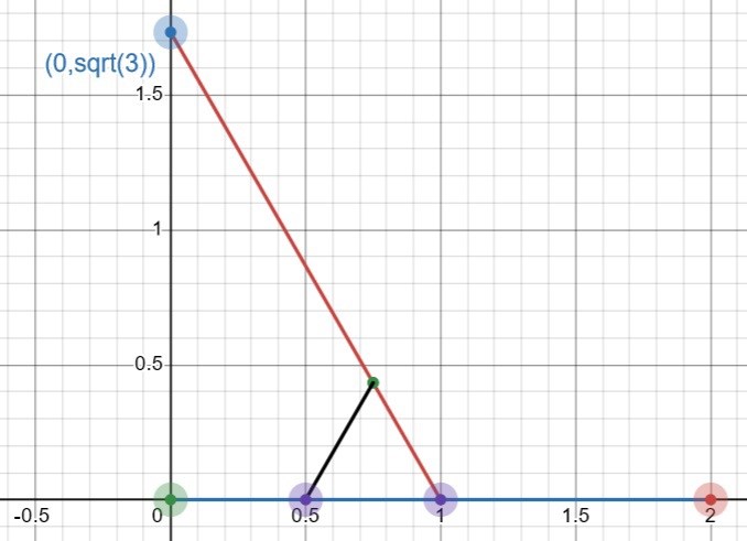 Om P_1 går från punkten p=(1, 0) till q=(0, sqrt(3)), så vi kan skriva linjen på vektorform som (1, 0) + (-1, sqrt(3))t. Här får jag riktningsvektorn från q - p.