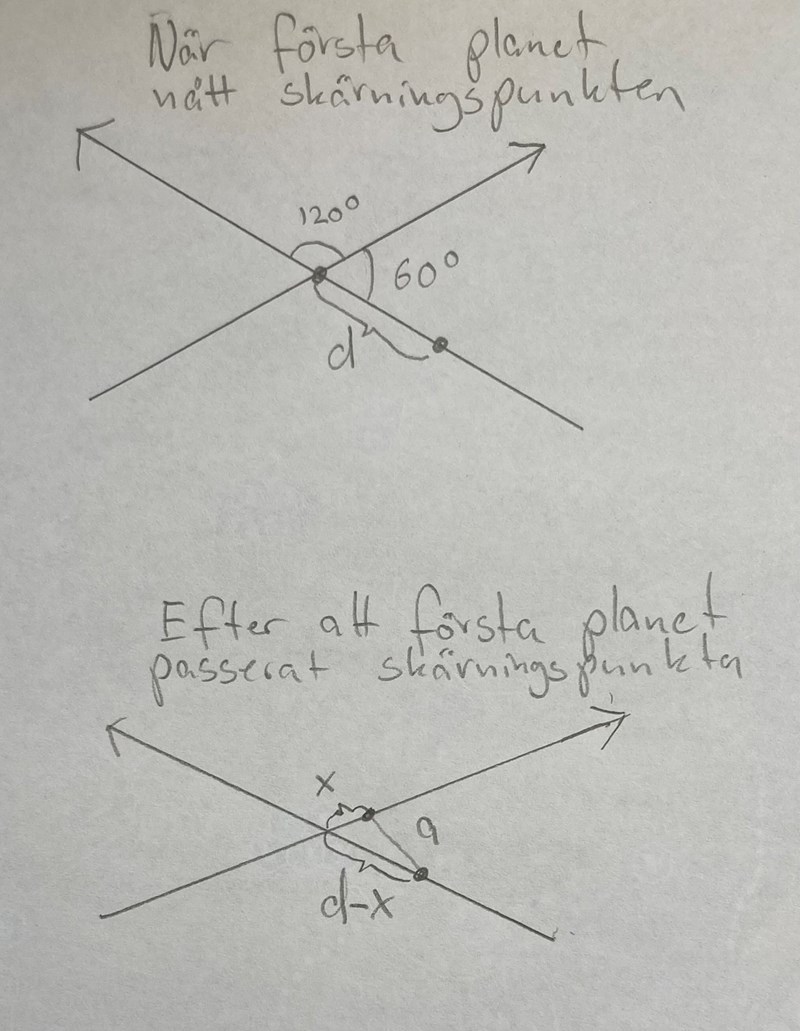 I princip är väl detta en uppgift man kan lösa enbart med cosinussatsen och derivata. Kortaste avståndet har man när första planet passerat skärningspunkten. Man får en triangel med sidorna x, d-x och vinkeln 60° mellan sidorna (se bilden). Sedan kan man ställa upp ett uttryck för avståndet i kvadrat a2 med cosinussatsen och minimera (samma x ger minimum för både a2 och a). Därefter beräknar man a.