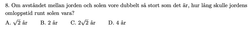 Avståndet mellan jorden och solen vore dubbelt så stort, jordens omloppstid runt solen vara?