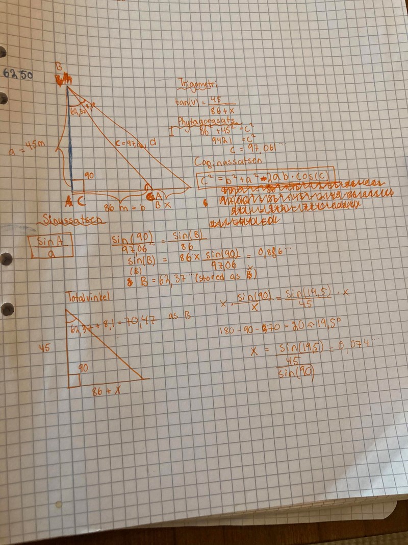 På slutet borde x bli 45/sin(19,5) i alla fall, men om det som står på fjärde sista raden är rätt vet jag inte.