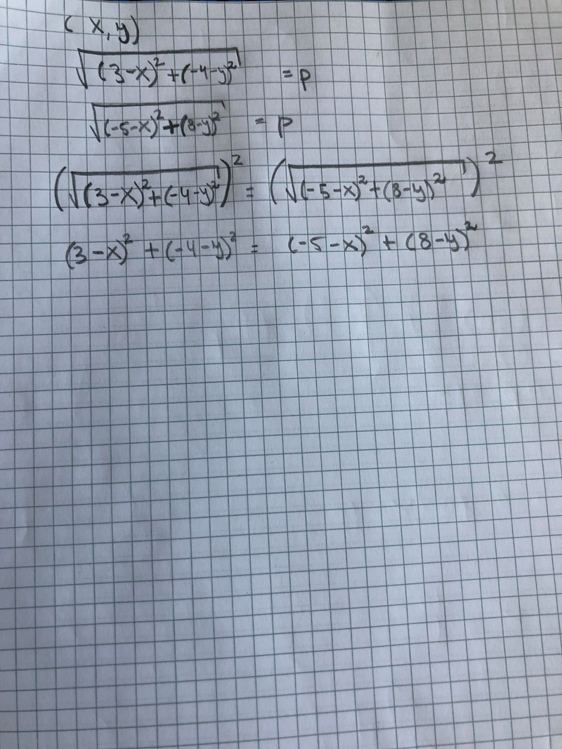 En punkt P på linjen y=2x har samma avstånd från (3,-4) som till (-5,8). Bestäm koordinaterna för punkten P.