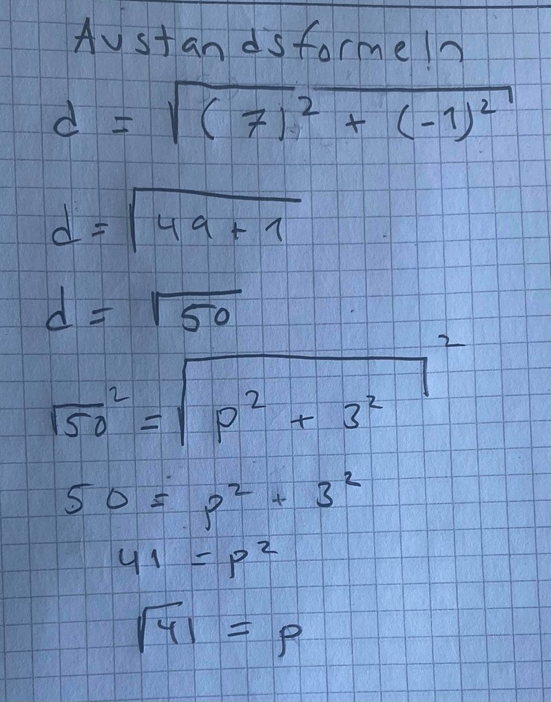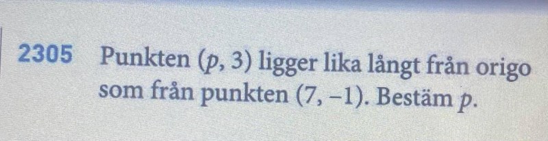 Bestäm p så att avståndet mellan (p, 3) och origo är lika stort som avståndet mellan (7, -1) och origo.