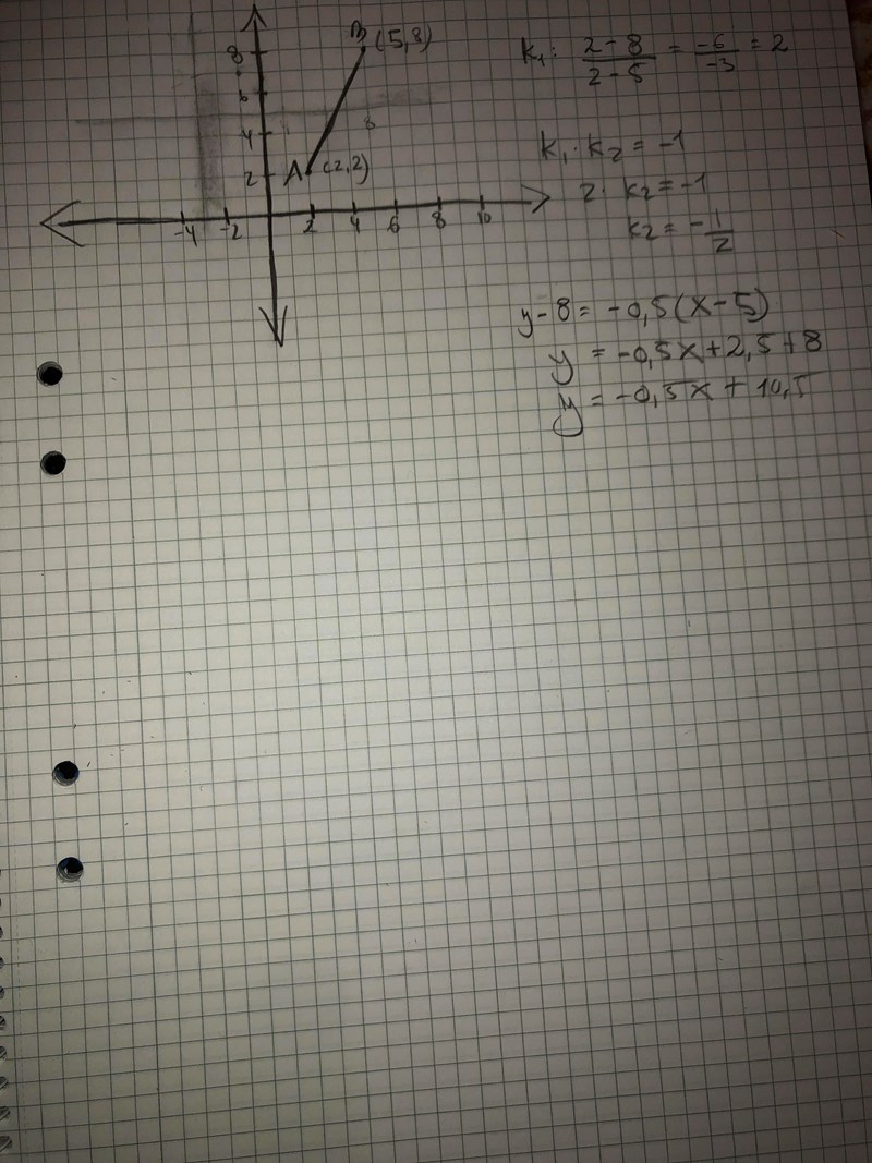 Du får reda på två saker i uppgiften. Den ena är att det ska vara en rätvinklig triangel med den räta vinkeln vid A. Det verkar vara det du tar hänsyn till när du tar fram k2. Du har alltså en linje med den lutningenm -0,5, so, går genom punkten A.Men dessutom får du veta att en sida till i triangeln ska vara lika lång som AB. Använd det också!