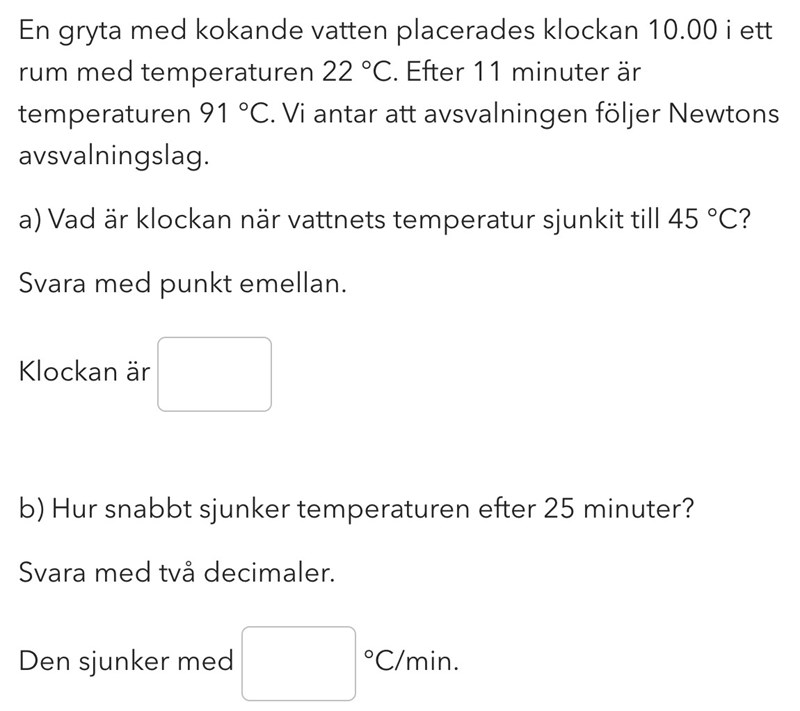 och sen beräkning för att besvara frågan: 100e^(-0,034t)+22=45 --> t=ca.45min och då får jag svaret till 10.43 men det är fel.