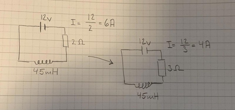 Ett 12v batteri har under längre stund varit kopplat till ett motstånd på 2.0Ω och en spole på 45mH. Plötsligt byts motståndet mot ett 3.0Ω motstånd. Vad är strömmen i kretsen efter 20ms?