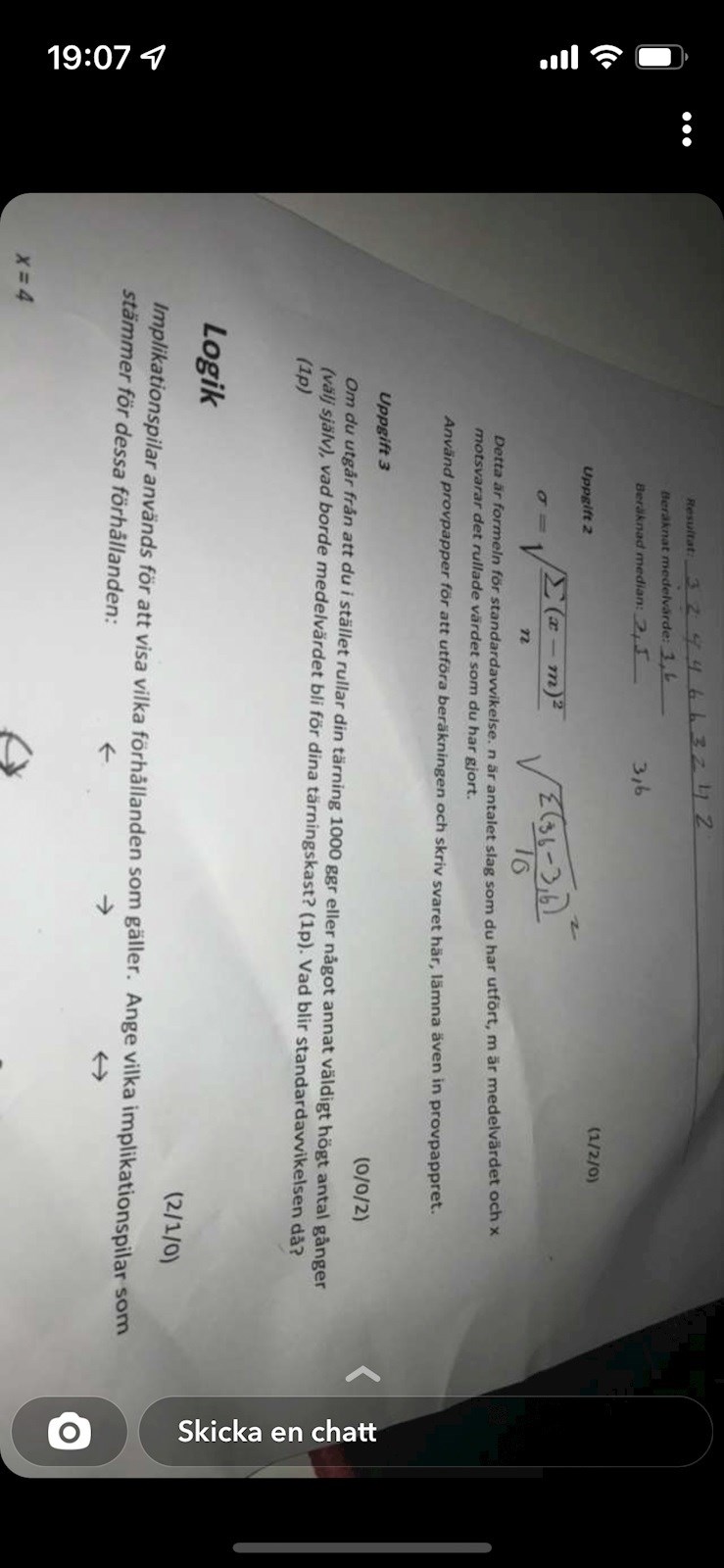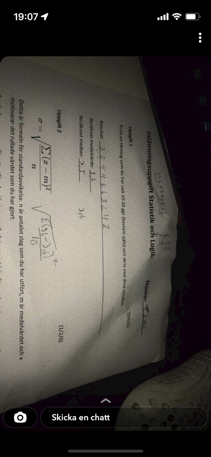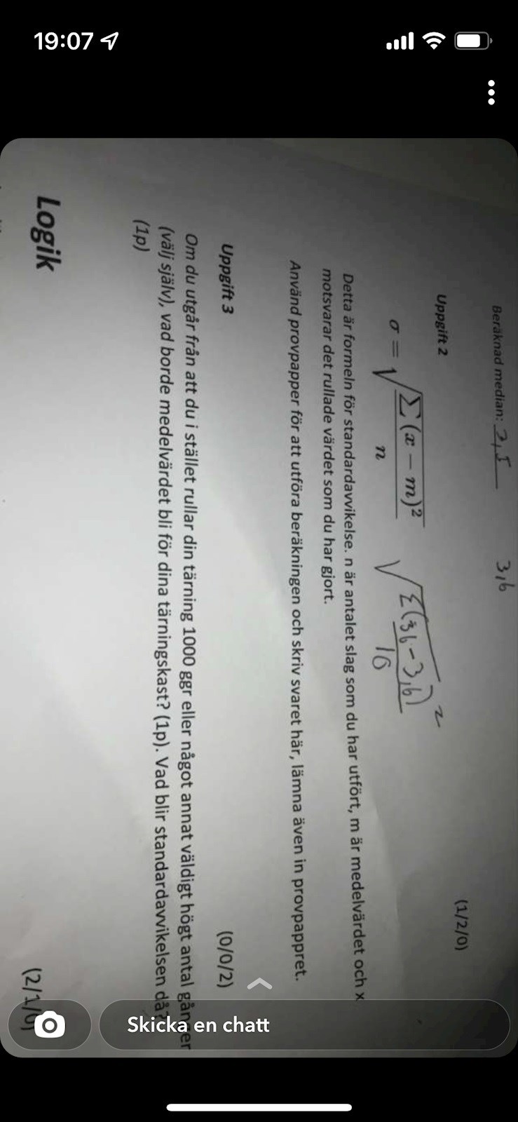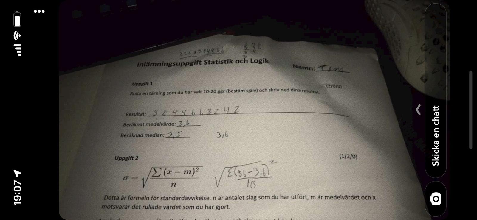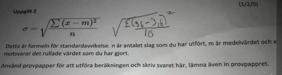 Du skall tydligen beräkna standardavvikelsen för dina tärningskast. Använd formeln i bilden.