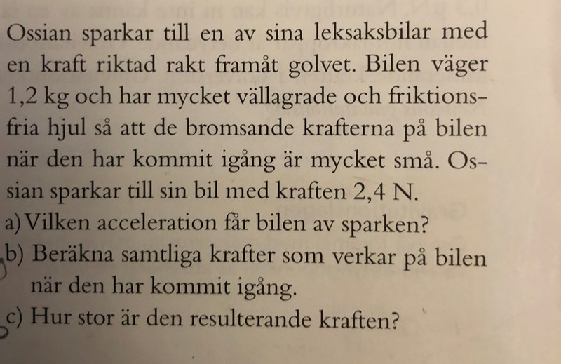 De krafter som verkar på bilen när den börjar rulla framåt är väl 2.4 N , normal kraften 12N och tyngden 12N. Men i facit finns inte ”2.4N Dragkraften med”. Hur ska man göra för att hitta alla krafter? Hur klurar man på sån här uppgifter?