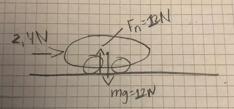Om det är så som du ritat så kommer bilen att rulla i all oändlighet. Men grejen är att 2.4N kraften verkar endast vid stöt ögonblicket. Annars har du rätt i Fg och N.