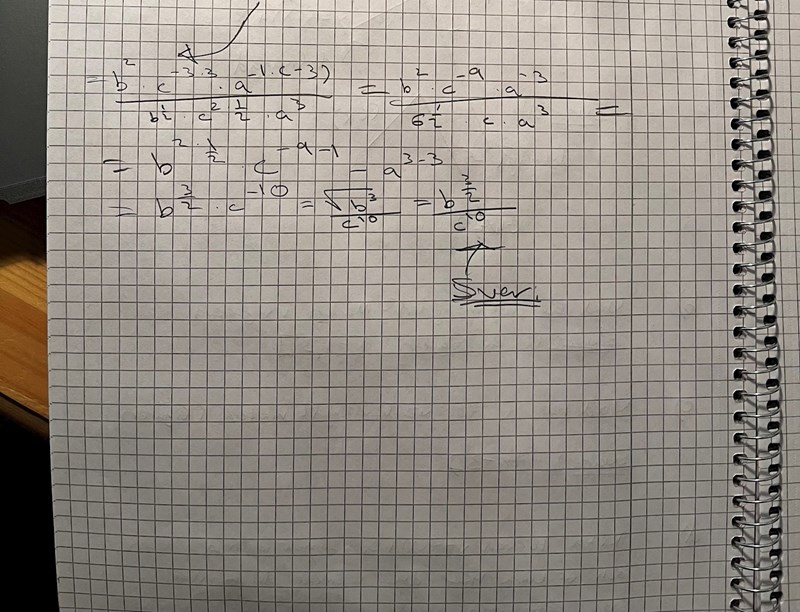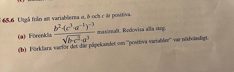 2. I ditt slutresultat har vi c10 i nämnaren. Då får c inte vara 0. Vidare har vi b3/2 Det betyder detsamma som att det finns ett rotmärke. Vi förutsätter att vi enbart arbetar med reella tal. Alltså måste b>=0 för att undvika negativt under rotmärket. Kan detta verkligen räcka? Nej! Det ursprungliga uttrycket måste vara giltigt för att vi ska kunna förenkla det och där finner vi alla tre variablerna i nämnaren. Alltså a, b och c får inte vara noll. c2 finner vi under rotmärket och det är alltid icke-negativt. Det medför att b som står framför måste vara positivt. b är faktiskt enda variabeln som måste vara positiv. För de övriga räcker det med att de är skilda från 0.