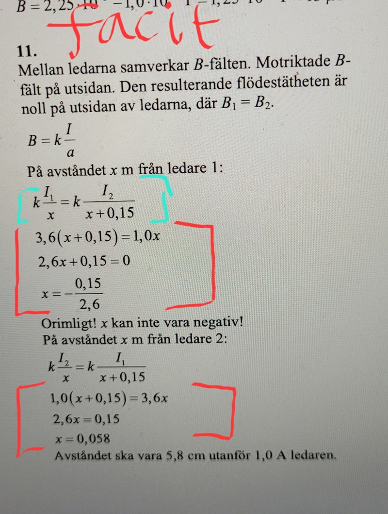 1. Det jag undrar är hur de i facit fick fram det som är markerat med blått. Är det för att B2 är 0,15 m längre bort än B1 och därför får B2= I/x+0,15 och B1= I/x(K stryks bort)
