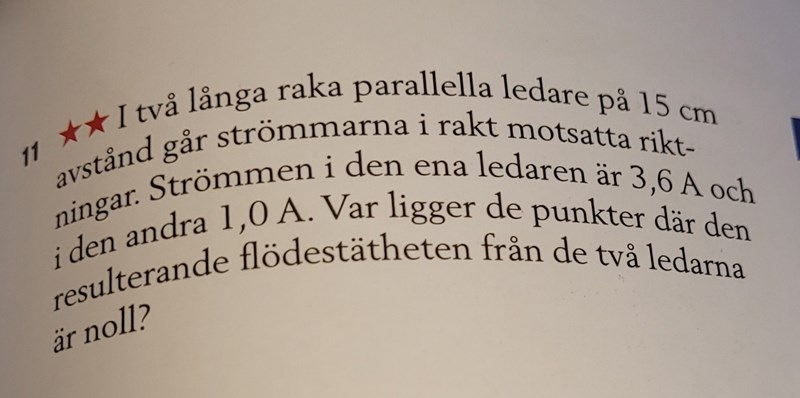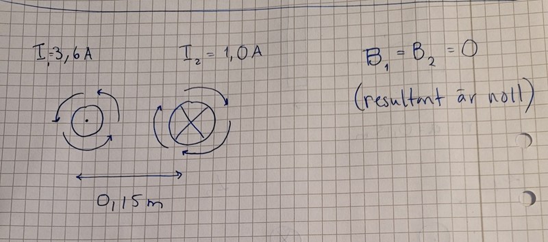 Och ledare 1,0 A har jag döpt till ledare 2 vilket gör att den har ett avstånd från ledare 1 på 15 cm så om jag får 20,8 där resultaten blir noll kommer jag att hamna utanför ledare 2 (1,0 A) med 5,8 cm?