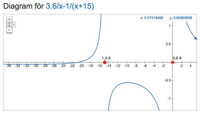 Fältstyrkan av ledaren med 1,0 ampere tar jag som proportionell mot 1/(x+15) på samma sätt som första lösningen i facit. Man ser att plotten divergerar vid x=-15 cm. Ledaren ligger alltså 15 cm till vänster om ledaren med 3,6 ampere (vid origo). Båda positioner är angivna med röda pluttar i min bild.