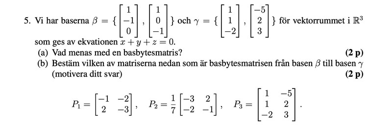 Det här kanske är till hjälp angående basbyten http://ingforum.haninge.kth.se/armin/ALLA_KURSER/SF1624/BASBYTE.pdf . går från basen beta till basen gamma. Tag en vektor uttryckt i koefficienterna i basen beta och gör ett basbyte till basen gamma. Jämför sedan i standardbasen om det är samma vektor.