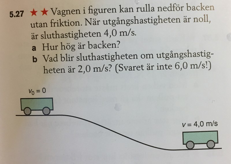 När vagnen har en begynnelsehastighet i b, vad har den då för potentiell och kinetisk energi i början?