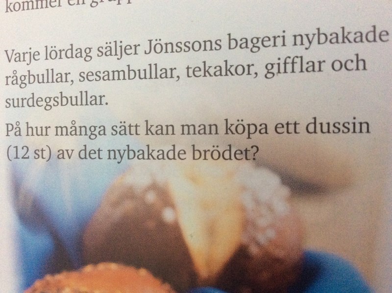 Smutstvätt skrev :Jag skulle tro att det är tänkt att du ska använda dig av avdelare i detta fall. Jag tycker själv att det är krångligt, så jag går igenom det systematiskt så att det inte blir fel. Vi kan köpa hur många sorter av varje bulle som helst, så länge det totala antalet bullar inte över- eller understiger 12 st. Jag utgår ifrån att det är accepterat att ogilla frön och därför köpa noll sesambullar. Ordningen spelar ingen roll, därför kan vi utgå ifrån att vi köper dem i ordningen RR, SS, TT, GG, SSSS. (med variation i antalet av varje sort)