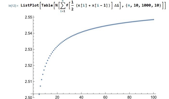 Höjer vi värdet på n till 100 får vi istället 2,0327