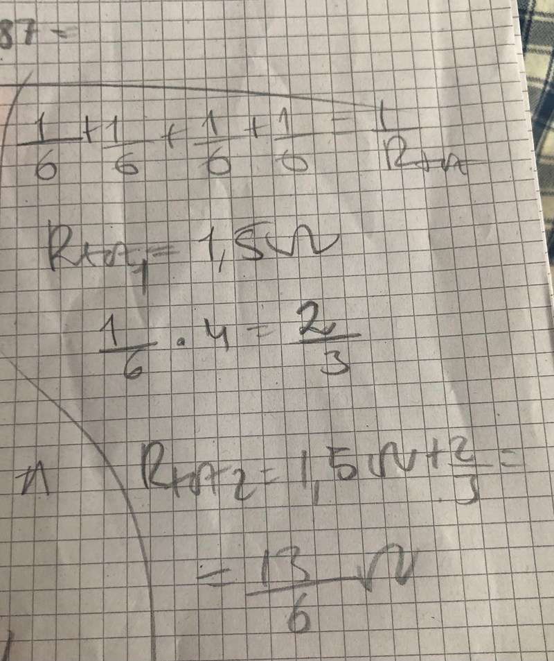 Börja med att rita om bilden så ser du att du har 4 resistanstrådar som är parallellkopplade (som du räknat ut till 2/3 Ohm.
