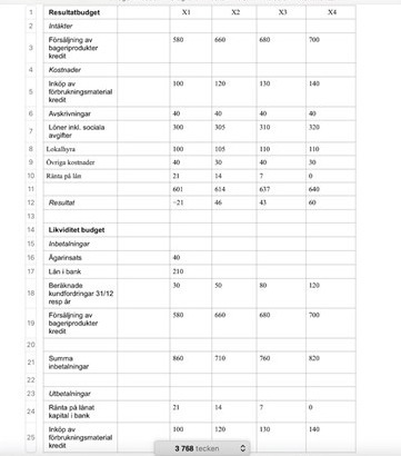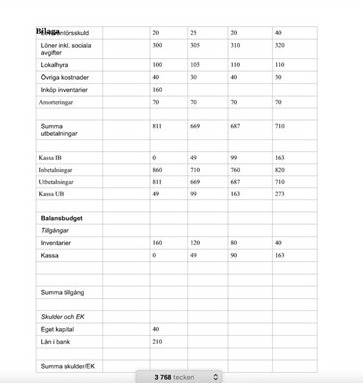Halloj, har i uppgift att göra en resultat-, en likviditets- samt en balansbudget på följande siffror. Tror jag fått till resultatbudgeten och likviditeten men kört fast när det kommer till balansbudgeten och vet inte hur jag ska börja. Är det någon vänlig själ som har tips på var man ska börja och tänka på när det kommer till balansen ?? Bifogar det jag gjort och så nedan..