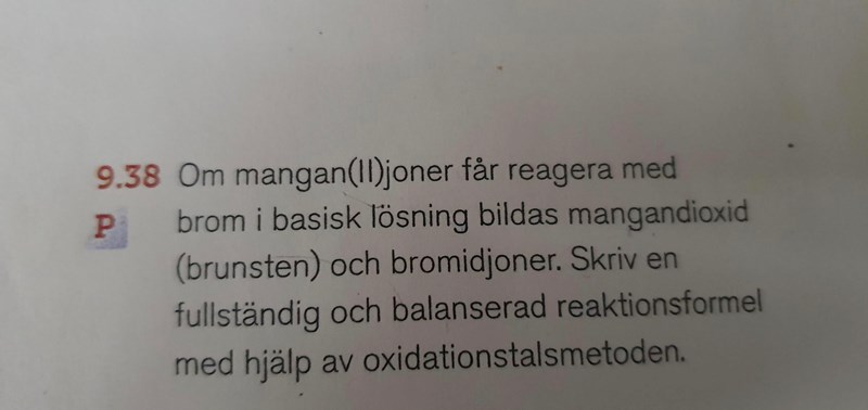 Mn+II + Br2 (som har oxidationsdal 0) + 2OH (då den ska vara basisk) --> MnO2 + 2Br