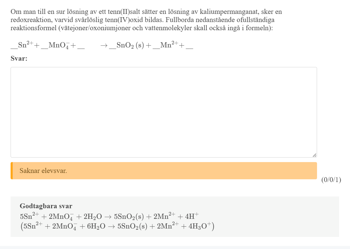 Därför att det står i uppgiften att reaktionen sker i sur lösning. Då ska du balansera laddningen med vätejoner. Hade det stått basisk lösning hade ditt svar varit rätt!