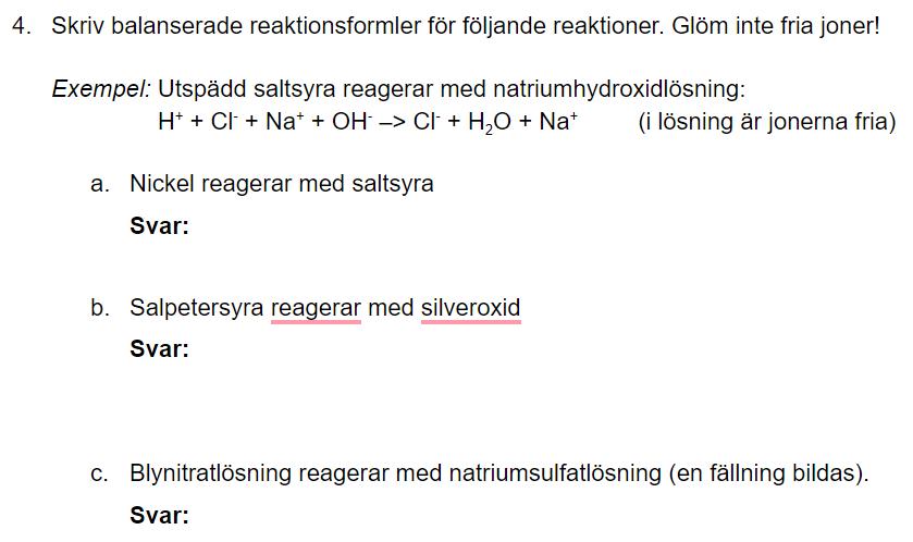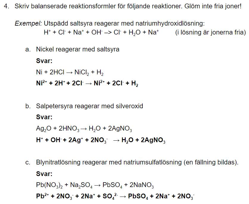 b) Jag hade fel när jag skrev redoxreaktion, det är en syrabasreaktion. Nej, du har en oxidjon, inte några hydroxidjoner.