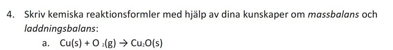 Alltså ingen 2a mellan Cu och 0. Varför är det så? Borde inte produkten bli samma för alla obalanserade reaktionsformler mellan Cu(s) och O2(g)? Förstår inte varför produkten på min uppgift har en 2a mellan Cu och O