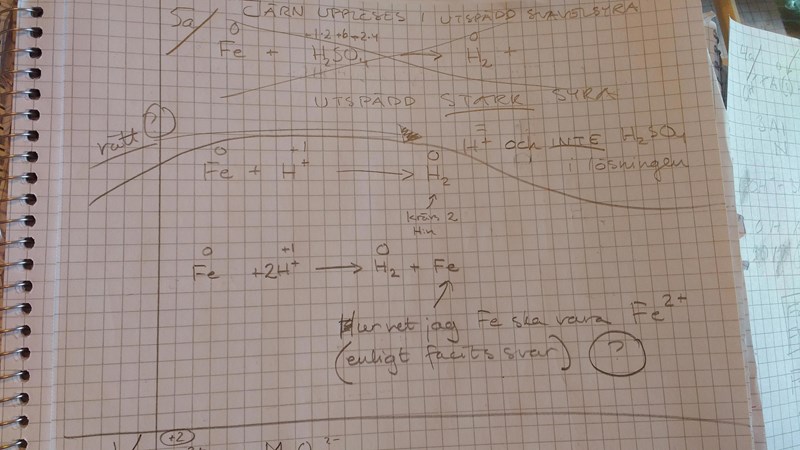 Första frågan är i övre delen av pappret "Rätt?" med en pil: tänker jag rätt där om svavelsyran och hur reaktionsformeln ska se ut?