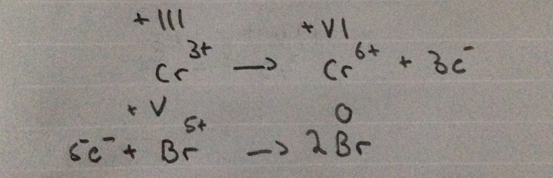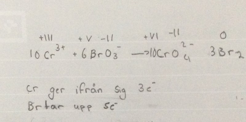 Edit: Du är inte Br -> Br det är BrO3- ->Br2 och det är Cr3+ -> CrO42-, viktigt!!!! Kolla alltid reaktionsformeln!