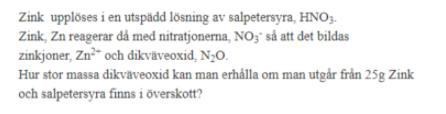 Det står i uppgiften att nitratjonen blir till lustgas (dikväveoxid). Eftersom det finns 2 kväveatomer i lustgas behöver vi börja med 2 nitratjoner. Vilket oxidationstal har kvävet i nitratjon? Vilket oxidationstal har (vardera) kväveatomen i lustgas? Hur många steg har varje kväveatom reducerats? Hur balanserar man antalet zink och antalet nitratjoner?