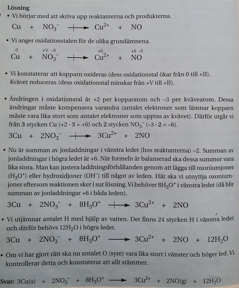 Detta ger summareaktionen: 3Cu + 2NO3- + 8H+ → 3Cu2+ + 2NO + 4H2O