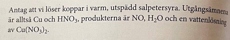 Det första du måste göra är att sätta ut oxidationstalen och konstatera att nitratjoner reduceras till kväveoxid. Då ser du också att koppar oxideras till koppar(II)joner (vi har det som produkt istället för kopparnitrtat).