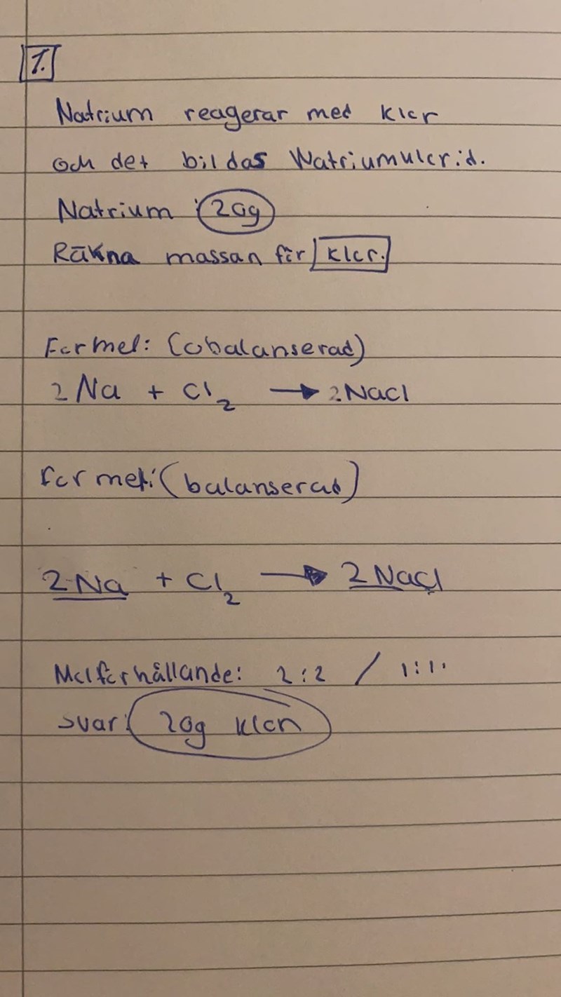Du har tillgång till 20 g natrium. beräkna massan för klor.
