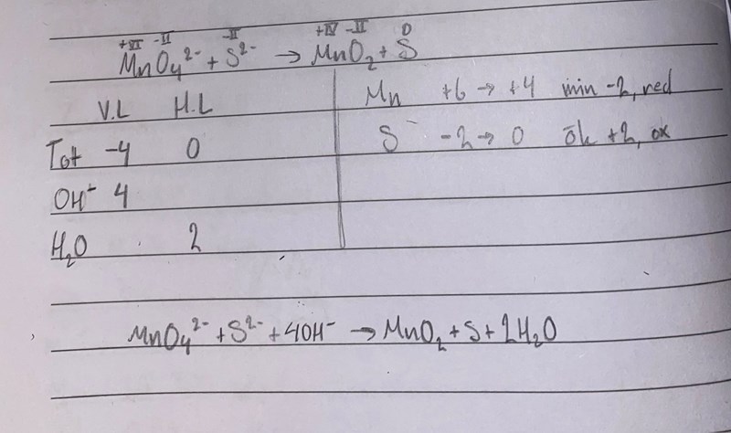 På uppgiften av kemilärare skrevs det MnO2-4 + S2- → MnO2 + S där 2- är upphöjt och 4 är nedsänkt på hos permangatjonen på vänsterled. I högerledet får permangatet endast en nedsänkt 2.