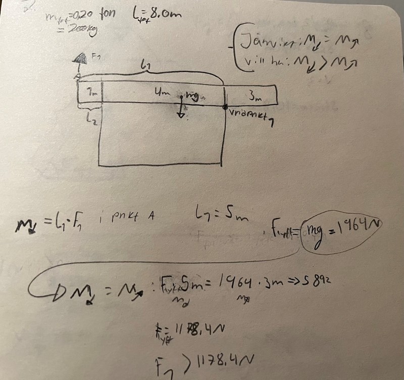 Uppgiften: En stålbalk med massan 0,20 ton ligger på ett block som figuren visar. Balken är totalt 8,0 meter läng och jamntjock. Beräkna den kraft som behövs för att balken ska börja tippa om man