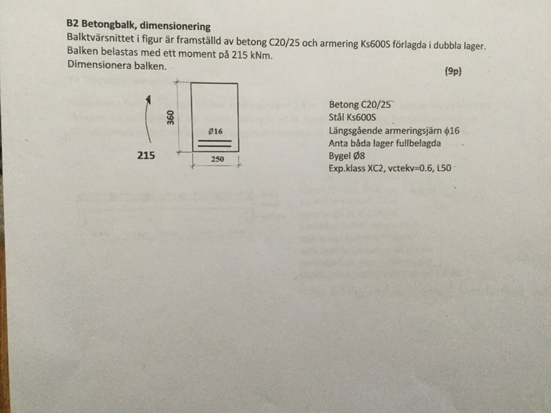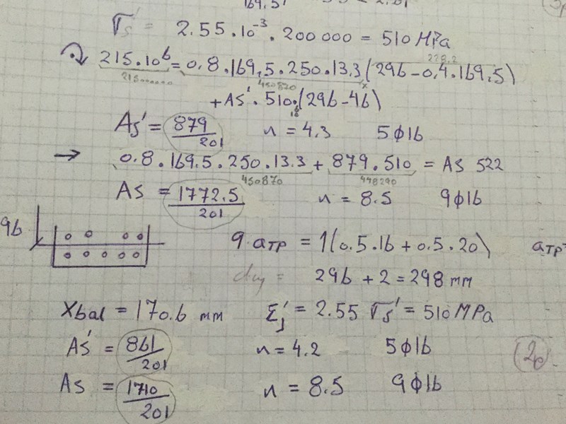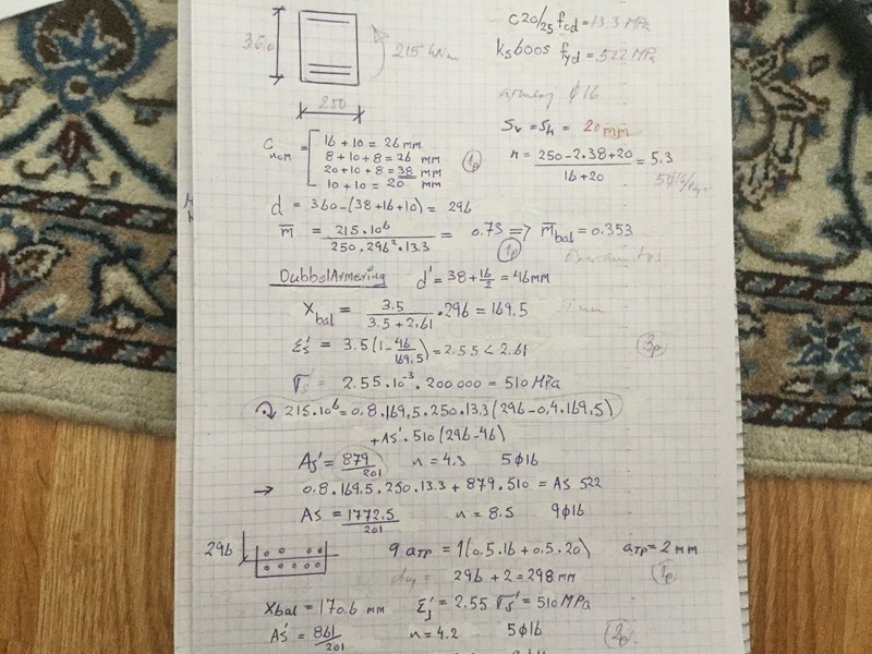 Så 215x10^6 - 0,8 * 169,5 * 250 * 13,3 ( 296- 0,4*169,5)/ 510x10^6 ( 296-46)= våra överkant blir As = 879/ 201 armering 16. Tusen tack Conny .