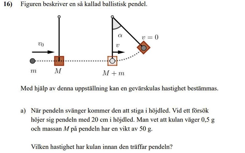 JohanF skrev:Kinetisk energi omvandlas till potentiell energi, ja. Så detta ger dig alltså hastigheten på M+m, direkt EFTER stöten. (kom ihåg att massan direkt efter stöten är m+M).