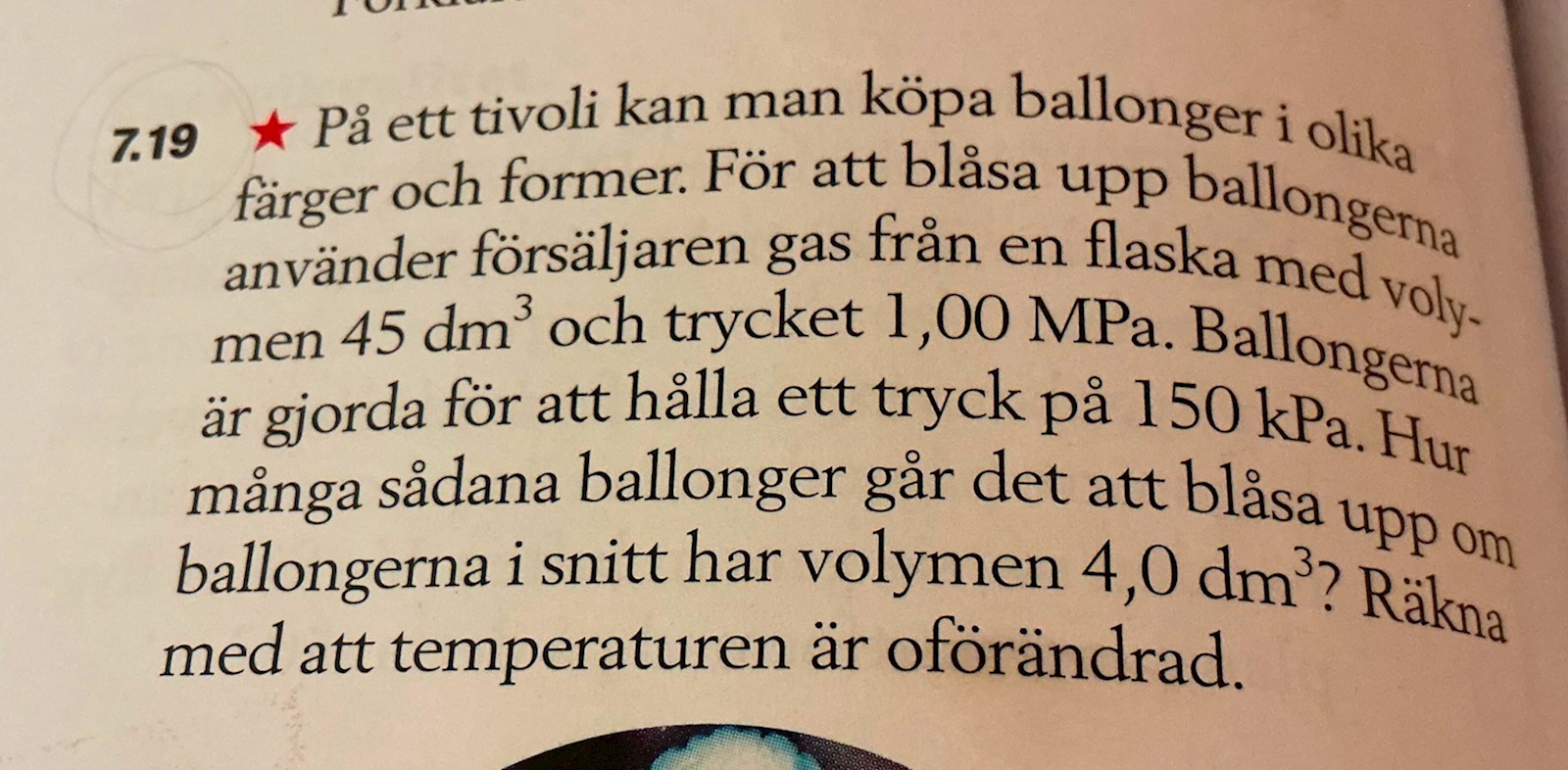 Hur som helst: Du har 45 dm3 gas med tryck 1000 kPa. Du skall fylla x ballonger med volymen 4,0 dm3 och ett tryck om 150 kPa.