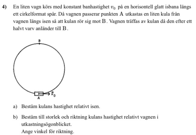 Om man sitter i vagnen och kastar rakt mot B när den passerar A, vad händer då? Vad blir hastighetens x- och y-komposant relativt isen?